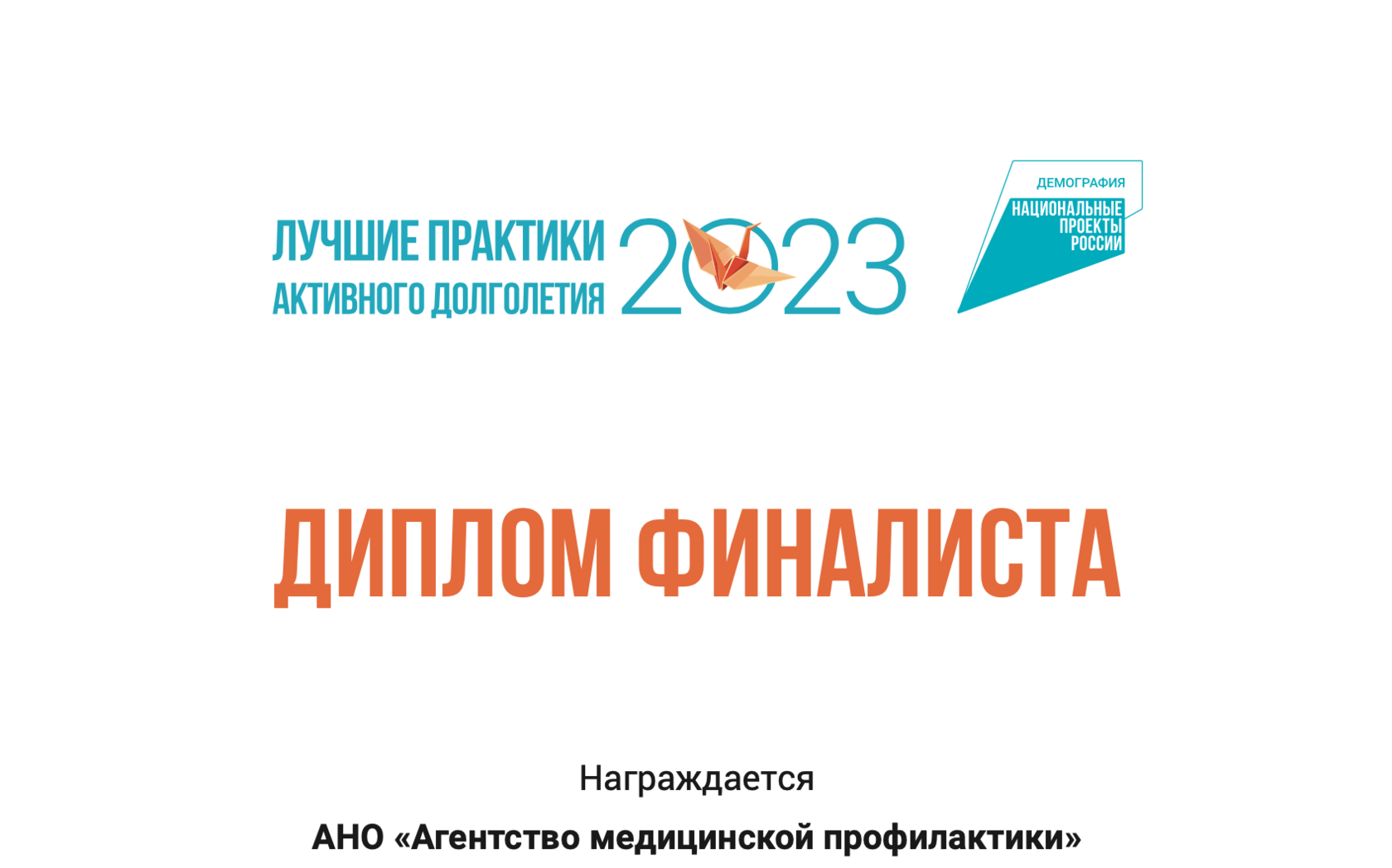 Проект «Здоровье 55+» Агентства медицинской профилактики стал финалистом четвертого Всероссийского отбора лучших практик активного долголетия. Всего в конкурсе участвовали 112 команд, в пяти номинациях: «Активная жизнь: культура, туризм, волонтерство», «Медицинский и социальный уход, общественная забота и профилактика», «Здоровый образ жизни», «Образование и занятость», «Практики для мужчин 60+».